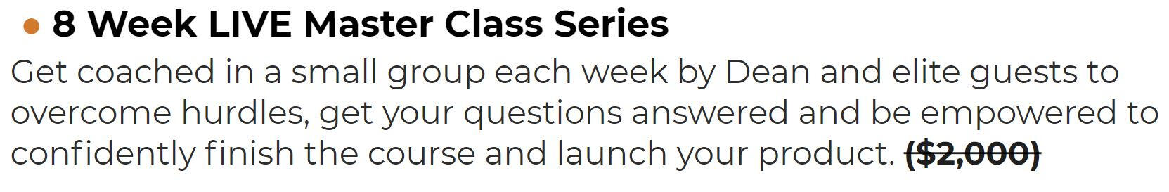 Get coached in a small group each week by Dean and elite guests to overcome hurdles, get your questions answered and be empowered to confidently finish the course and launch your product. ($1,997)